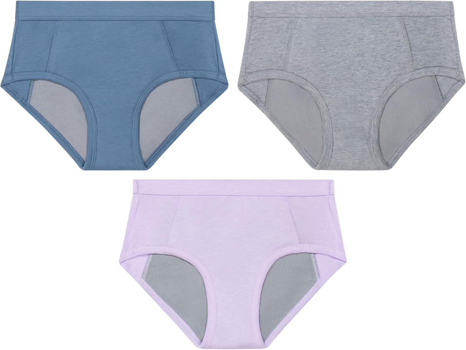 Hanes Absorbency Briefs, 3 Pairs, Confident Nights Cotton Overnight Underwear for Girls(Purple/Mist/Grey)